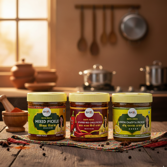 Combo Pack – Mango, Lal Bharwa Mirchi, Mixed Pickle (250g each)