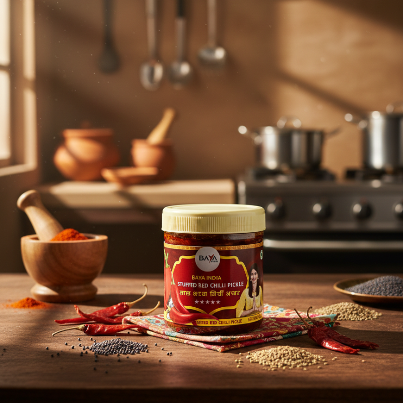 Lal Bharwa Mirchi (250g): Hand-stuffed red chilies with a bold blend of Indian spices – fiery, flavorful, and unforgettable.